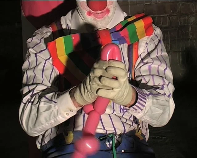 The performance in the live action videos, ‘Untitled (feat. Sean Price)’ and ‘Untitled (feat. Rachel Russell)’, is of an unnamed clown. In ‘Untitled (feat. Sean Price)’, his act is delivered to an audience of balloon animals. In ‘Untitled (feat. Rachel Russell)’ the clown is shown alone in his dressing room preparing for his show. The show is more an act of compulsion than volition, a performance more rooted in humiliation than entertainment. It is through this attempt at performance though that he fashions some semblance of an identity.